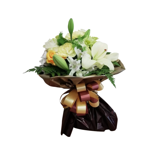 Bouquet com coroa imperial, margaridas, cravo, rosas e verduras.