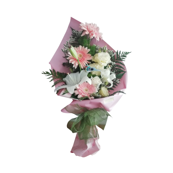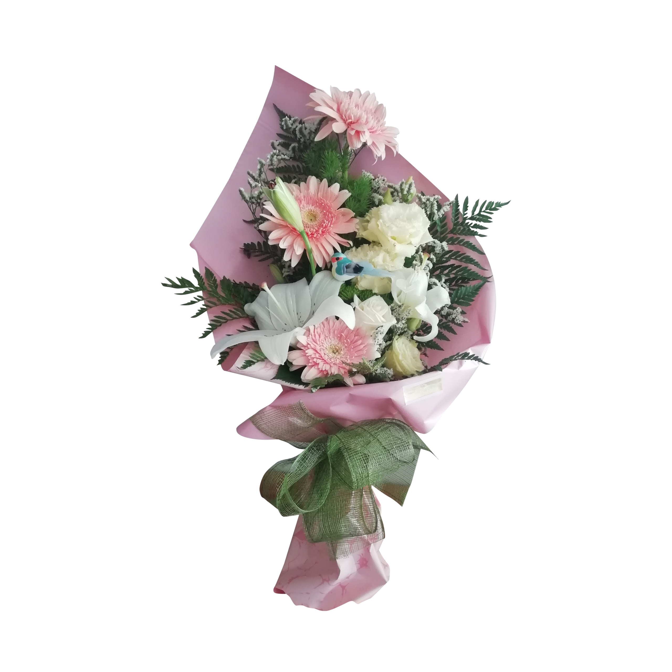 Ramo com gerberas, coroa imperial, eustomas e verdura.